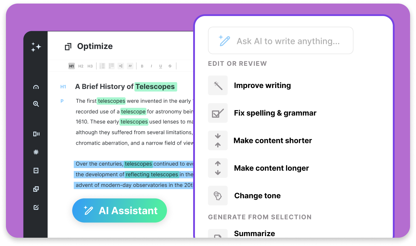 Our software provides personalized insights on how to improve even your best-performing articles to show your audience (and Google) that you’re an expert.